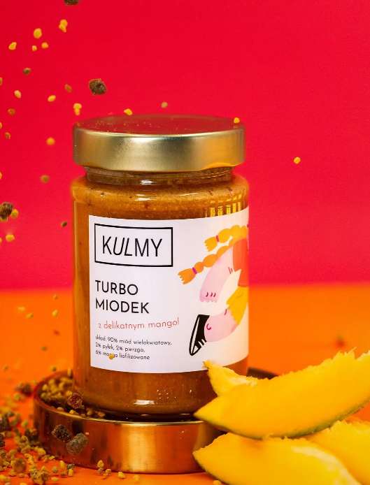 Turbo miód z mango  od Kulmy to naturalna multiwitamina której, bazą jest wysokiej jakości miód wielokwiatowy, który połączono z pyłkiem i pierzgą pszczelą, a całość uzupełniono liofilizowanym mango, nadającym świeży, lekko owocowy charakter. Dzięki procesowi kremowania produkt zyskuje przyjemną konsystencję, łatwą do podania i idealną do jedzenia prosto ze słoika. Szczególnie polecany dla dzieci powyżej 3 roku życia oraz dla wszystkich, którzy cenią sobie wyjątkowe walory smakowe. Dla tych, którzy poszukują naturalnych i smacznych rozwiązań, na dobre rozpoczęcie dnia, ale wolą słodki smak niż bardziej tradycyjny i wytrawny klasycznego turbo miodu.