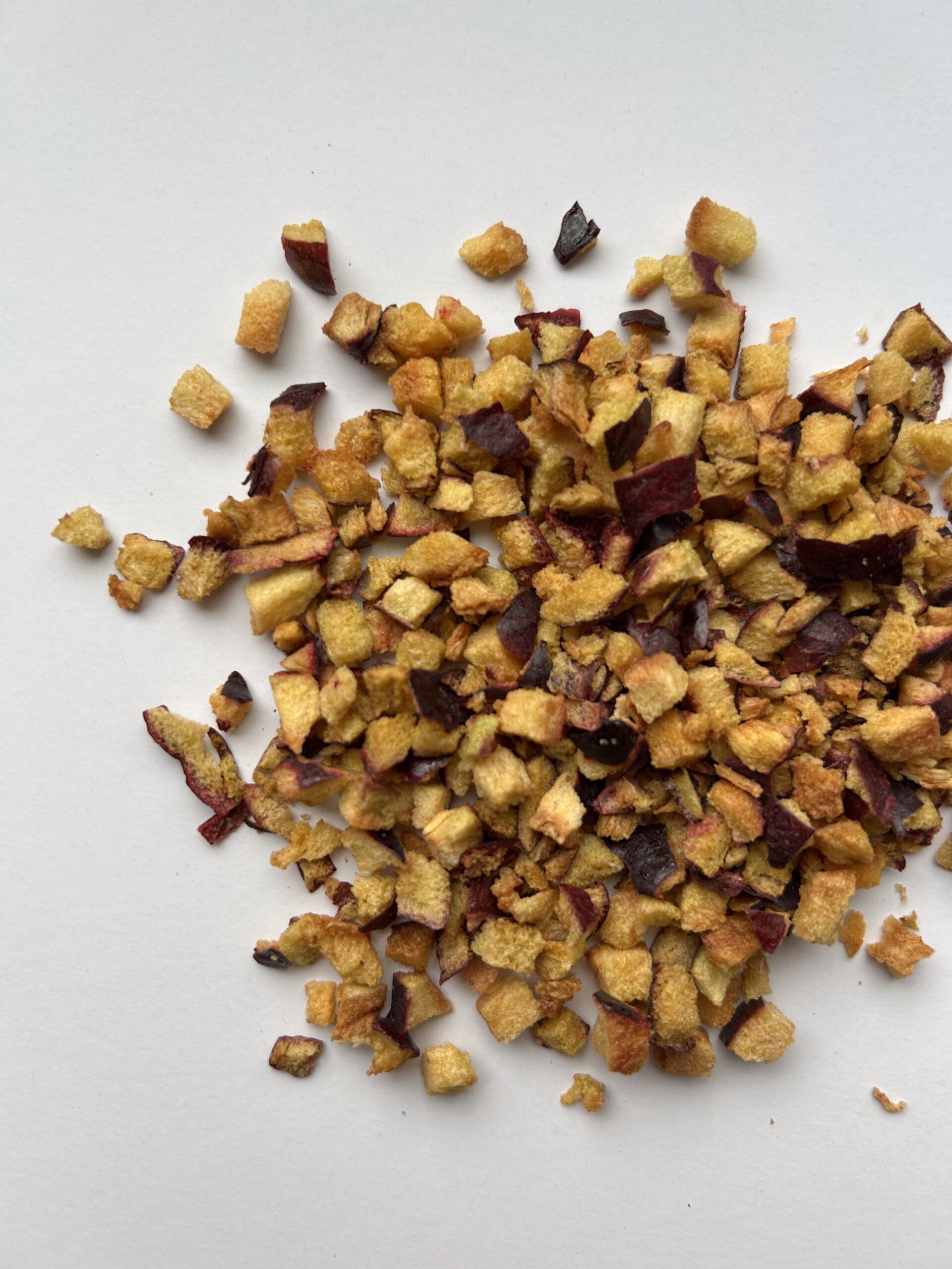Chrupiąca, liofilizowana śliwka w formie kostki to idealna przekąska bez dodatku cukru czy konserwantów, wegańska, pełna smaku i aromatu naturalnego owocu. Doskonała jako dodatek do musli, smoothie czy owsianki. Naturalna słodycz i chrupkość w jednym.